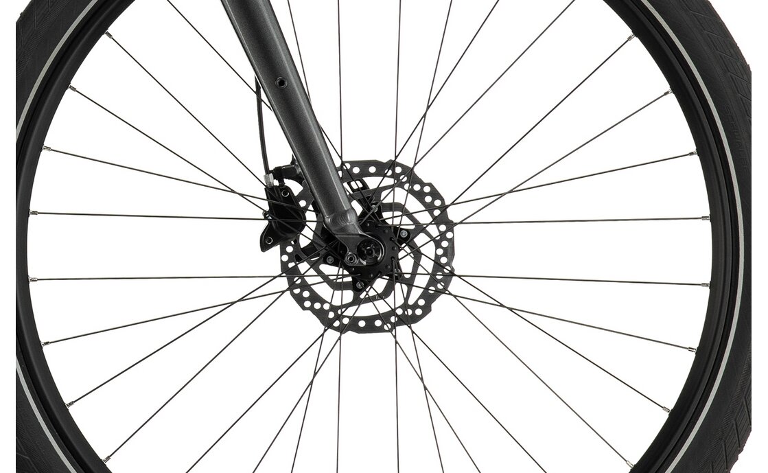 - Bremsen: Die Shimano BR-MT200 hydraulische Scheibenbremse sorgt für eine zuverlässige Bremsleistung auf wechselndem Untergrund und bietet dir ein sicheres Gefühl bei jedem Bremsvorgang. Sie ist ideal für sportliche Pendler sowie für längere Touren im Gelände, sodass du sowohl im Stadtverkehr als auch auf unbefestigten Wegen bestens gerüstet bist.