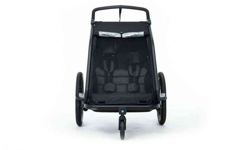 Der CUBE Kinder Fahrradanhänger Double CMPT ist der optimale Begleiter durch den Alltag. Das Multitalent besticht durch ausgeklügelte Funktionen als Fahrrad-Anhänger und Kinderwagen. Der große Insektenschutz an der Front und den Seiten hält ungewollte Fahrgäste vor dem Eindringen ab, ohne dabei die Frischluftzirkulation zu beeinflussen.